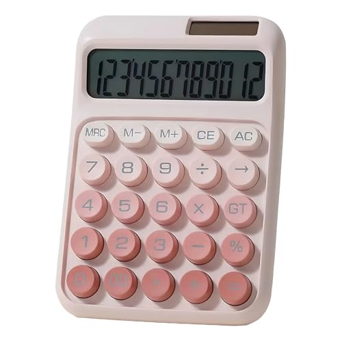 ピンクカラーベースのグラデーションデザインが施されている電卓はいかがですか。12桁表示で、キーの形もかわいい丸型なのでおすすめです。