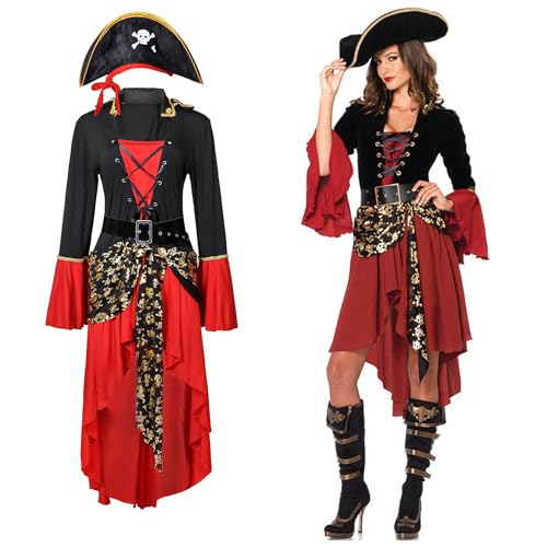 かっこいい系なら、やっぱり「海賊」でしょうね。特に女性の海賊の衣装はゴージャスだし、かっこよさもひとしおです。こちら、ドレスと帽子と太ベルトの3点セットです。