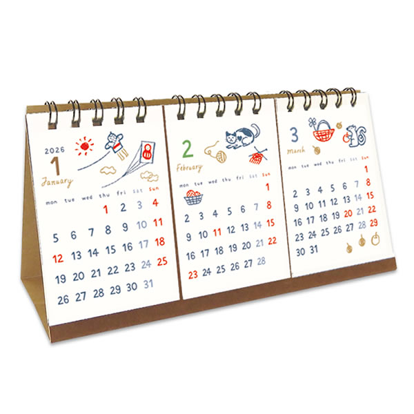 3か月分が一度に見渡せる卓上カレンダーで、予定の管理やスケジュール調整がひと目で簡単。月曜始まりでビジネスや家庭の計画にも便利で、書き込みスペースも十分確保。コンパクトながら見やすく、デスクやキッチンなど置く場所を選ばず使いやすいデザイン。本庄綾子氏のイラストがさりげなく彩りを添え、実用性と美しさを両立。日々の予定管理を効率化しながら、気分も明るくなるおしゃれな卓上カレンダーです。