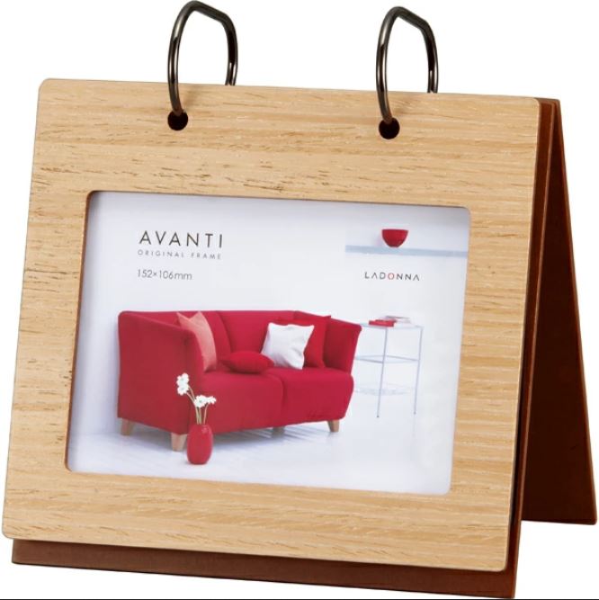 ラドンナの写真立てにもなるアルバム型フォトフレームです。ナチュラル又はダークブラウンカラーのシンプルでオシャレな木目調デザインになっており、べニア/MDF/スチールの材質の165x175x奥行130㎜サイズで写真を50枚収納できるめくり型フォトフレームです。コスト的にもリーズナブルなものですので、良いのではないかと思います。