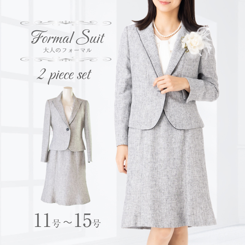 ライトグレーのラメ入りツイード素材で華やかさと上品のあるスーツはいかがでしょうか。シンプルで着回ししやすいと思うのでおすすめします。