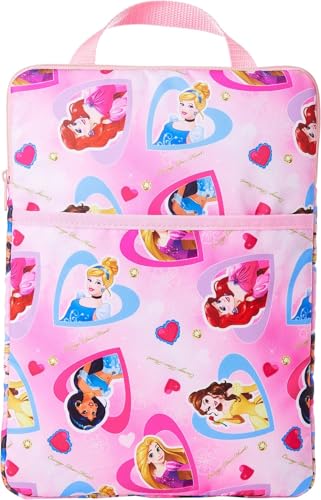 ディズニーの人気プリンセスたちが勢ぞろい!10.2インチのタブレットに対応したこちらのタブレットバッグがお薦め!シンデレラや美女と野獣やアラジンや塔の上のラプンツェルやリトルマーメイドのプリンセス達がハート柄の中に入っていてかわいいですよ。素材はピンク色のポリエステル100%の生地です。ウレタンが中に入っておりクッション性もあり衝撃から機器を守ります。ハンドル付で持ちやすくランドセルにも入ります。