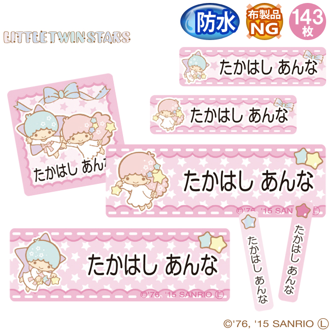 SanrioキャラクターズのLITTLE TWIN STARS.キキ&ララお名前シールをは如何でしょう。可愛いキラキラ☆柄のゆめ星雲の思いやり星で生まれた双子きょうだいでイイ感じですよ