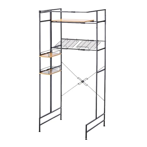 頑丈さで言えば突っ張り式より置型のラックが良いと思います。こちらの商品は洗濯機に合わせ幅の調整が可能。高さも185cmと十分で、中間棚の設置場所も選べるタイプ。背面には筋違が装備されているのでぐらつきもない製品です。