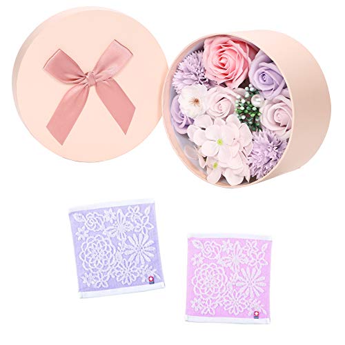 上品なソープフラワーと今治タオルハンカチのセットはいかがでしょう。ピンクやパープルの可憐なフラワーが円形ボックスに入っており、そのまま飾って楽しむこともできますよ。タオルハンカチは実用的ですし、デザインもお花のイメージに合っていてオシャレですね。メッセージカードも付けられますので、心のこもったギフトになると思います。