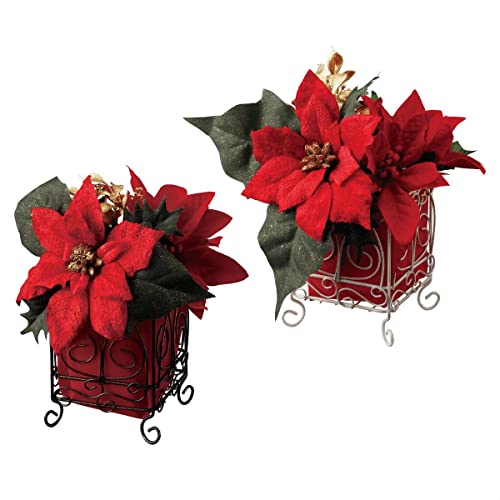 こちらのポインセチアがメインのアレンジメントはいかがでしょう?造花ではありますが、体裁の良い籐の籠に入り松ぼっくりや星やリボンなども添えられていてクリスマスムード満点でオシャレです。活け方の手法もキチンとしているので、カウンターなどに置けばかなり様になると思い選びました。小振りで場所も食いませんし、おススメです。