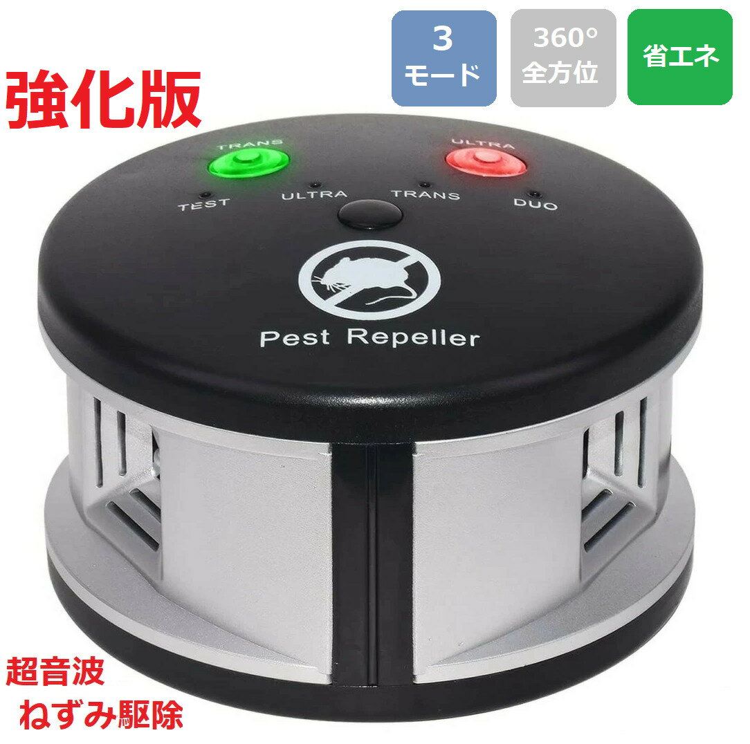 家庭用に使える非電池式の超音波ネズミ駆除器です。シンプルなデザインになっており、360度に効果のある強化版で3種モード・静音の24時間連続稼働の機能的なネズミ除けグッズです。省エネの使いやすく便利なアイテムで、コスト的にもリーズナブルなものですので、良いのではないかと思います。