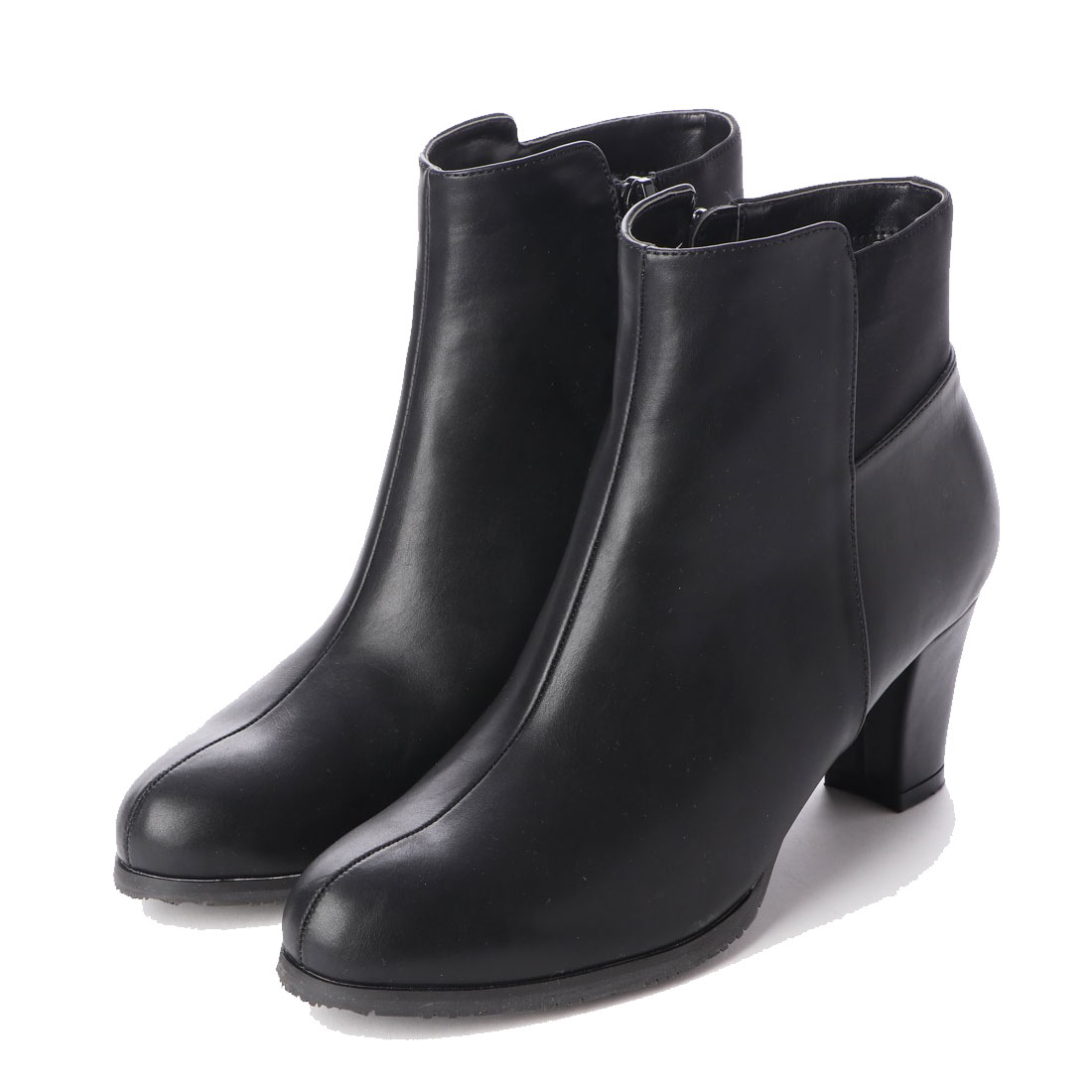 日本製のスクエアトゥのシンプルショートブーツはいかがでしょう。雨晴れ兼用のレインブーツとして重宝します。しっかりとした6センチヒールで滑りにくく、楽に歩けます。